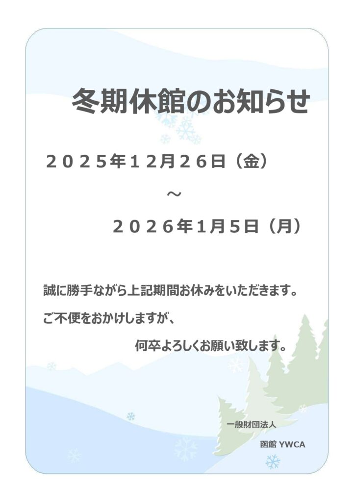 【お知らせ】函館YWCA冬期休館のお知らせ 新着情報 函館YWCAの会館は2025年12月26日(金)~2026年1月5日(月)まで冬期休館致します。 2026年1月6日(火)より通常開館致します。 2025.12.06