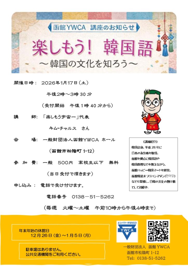 2026年1月17日(土)午後2時~午後3時30分 楽しもう!韓国語  ~韓国の文化を知ろう~